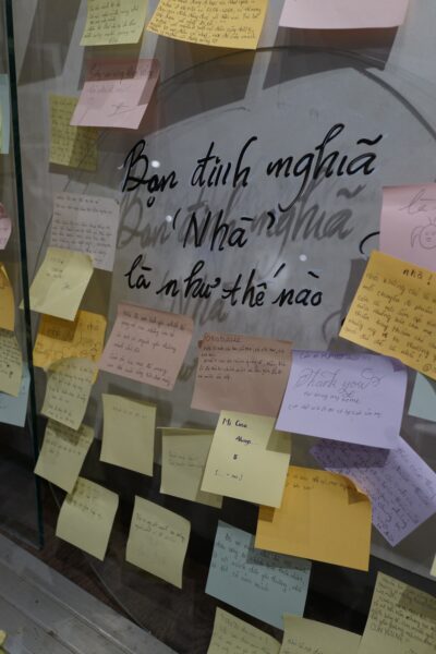 (Saigon, 2022) Defining Happiness: Another wall from my exhibition Lặng (Solitude), where visitors responded to the prompt “Hạnh phúc với bạn là gì?” (“What does happiness mean to you?”). The responses, written in Vietnamese, English, or hybrids of both, revealed how language shapes, limits, and sometimes liberates the way we understand well-being. Many participants used metaphors, invented new words, or described emotions that didn’t have a direct translation. This became a living archive of culturally specific definitions of happiness, beyond textbook psychology or Western frameworks.