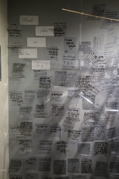 (Saigon, 2022) Letters to Home: A wall installation from my exhibition Lặng (Solitude) features anonymous handwritten responses to the question “What does ‘home’ mean to you?” The exhibition invited public reflection in the form of Post-it notes, which were added over time by visitors of all ages. The responses, ranging from single words to deeply personal stories, create a layered and communal archive of lived emotional experience.